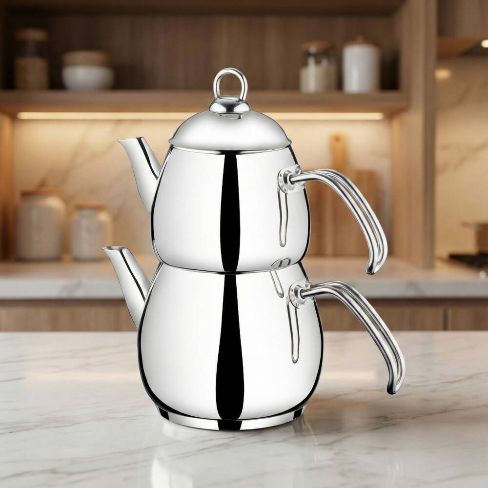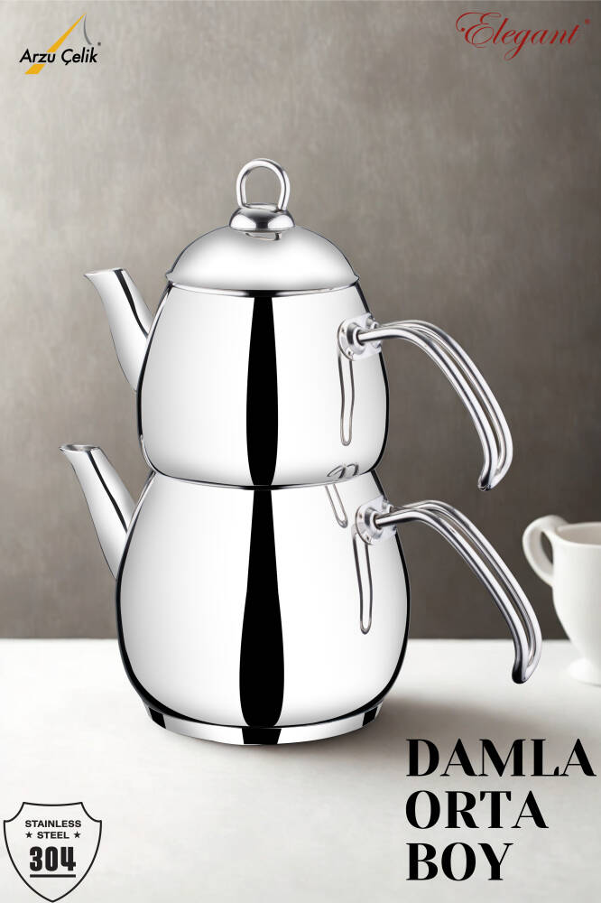 Damla serisi orta boy çaydanlık takımı, zarif damla formu ve çelik kulp tasarımıyla mutfaklarda şık bir görünüm sunar. Klasik demleme sevenler için idealdir. Takım; 2 Lt. alt suluk ve 1,25 Lt. üst demlikten oluşur. Günlük kullanıma uygun kapasitesiyle pratik ve konforlu bir çay deneyimi sağlar.