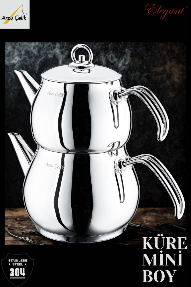 Küre serisi mini boy çaydanlık takımı, kompakt ölçüsüyle az kişilik kullanım için idealdir. 304 paslanmaz çelik gövdesi dayanıklı ve uzun ömürlüdür. Çelik kulp tasarımı sağlam bir tutuş sunar. Takım; 1,5 L alt suluk ve 0,75 L üst demlikten oluşur. İndüksiyon uyumlu tabanı sayesinde farklı ocak tiplerinde güvenle kullanılabilir. Ürün Türkiye menşeli olup 2 yıl garanti ile sunulmaktadır.