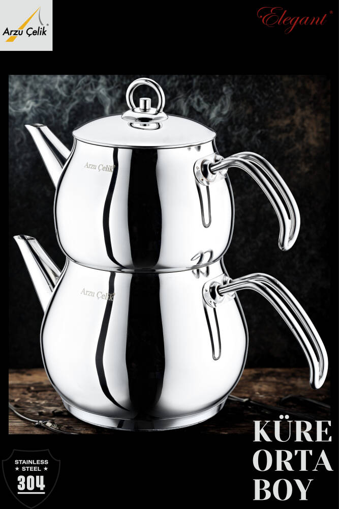 Küre serisi orta boy çaydanlık takımı, yuvarlak formu ve dengeli tasarımıyla mutfakta şık bir görünüm sunar. 304 paslanmaz çelik gövdesi dayanıklıdır. Çelik kulp yapısı ile sağlam ve uzun ömürlü kullanım sağlar. Takım; 1,75 L alt suluk ve 1 L üst demlikten oluşur. İndüksiyon uyumlu tabanı sayesinde farklı ocak tiplerinde güvenle kullanılabilir. Ürün Türkiye menşeli olup 2 yıl garanti ile sunulmaktadır.