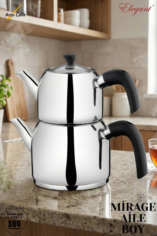 Mirage serisi aile boy çaydanlık takımı, geniş kapasitesiyle kalabalık sofralar ve yoğun kullanım için idealdir. 304 paslanmaz çelik gövdesi dayanıklıdır. Siyah bakalit kulpları sayesinde elde güvenli ve konforlu bir tutuş sağlar. Takım; 2,75 L alt suluk ve 1,5 L üst demlikten oluşur. İndüksiyon uyumlu tabanı sayesinde farklı ocak tiplerinde güvenle kullanılabilir. Ürün Türkiye menşeli olup 2 yıl garanti ile sunulmaktadır.